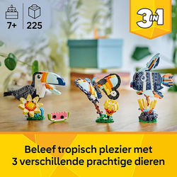 Kinderen kunnen 3 verschillende LEGO speelgoeddieren bouwen met dezelfde stenen: een verstelbare toekan met een schijf watermeloen die in zijn snavel kan worden geplaatst, een kleurrijke vlinder met verstelbare vleugels die over het gras en een bloemenstandaard vliegt, en een tropische vis met verstelbare vinnen die 360 graden kan draaien op zijn standaard.